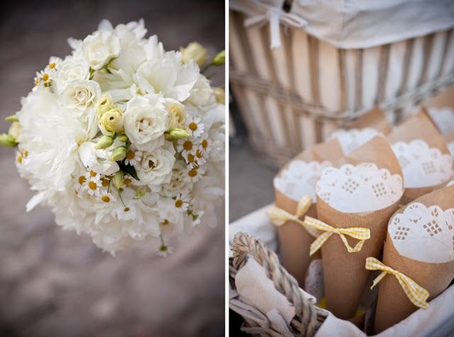 Ragazze che ne dite di un ricevimento in campagna country chic con cestini come centrotavola con fiorellini di campo, avanda e margheritine? E magari, la sera tante piccole lanternine bianche ad illuminare gli alberi (prenderà fuoco tutto?? ) ...