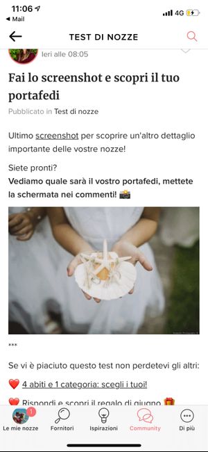 Ultimo screenshot per scoprire un'altro dettaglio importante delle vostre nozze! Siete pronti? Vediamo quale sarà il vostro portafedi, mettete la schermata nei commenti! 📸 *** Se vi è piaciuto questo test non perdetevi gli altri: ❤️ 4 abiti e 1...