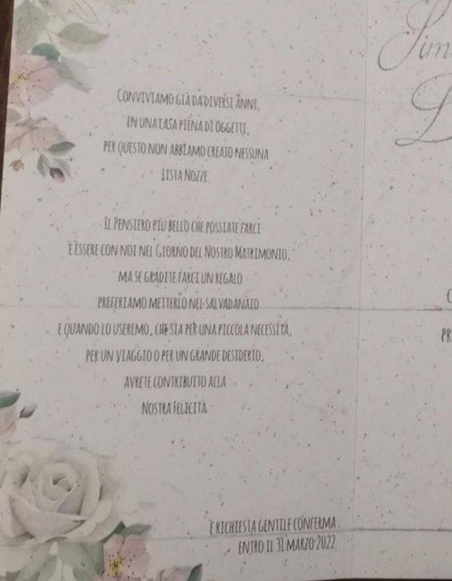 Ciao a tutte, finalmente sono arrivate le partecipazioni 😊 Abbiamo fatto un unico cartoncino al centro le informazioni del matrimonio e ricevimento di fianco a sinistra abbiamo messo informazioni su lista nozze che in realtà non abbiamo. Ora mi è...