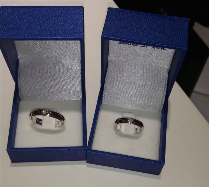 Finalmente dopo svariati impicci le fedi sono state ritrovate dalla gioielleria ☺️ sembrano delle fedi diverse per via della luce Oro bianco giallo e diamante 😍😍 non abbiamo resistito e le abbiamo provate 🎆