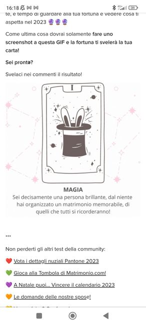 Ora che hai risposto a tutte le domande e so di più su di te, è tempo di guardare alla tua fortuna e vedere cosa ti aspetta nel 2023 🔮🔮🔮 Come ultima cosa dovrai solamente fare uno screenshot a questa GIF e la fortuna ti svelerà la tua carta! Sei...