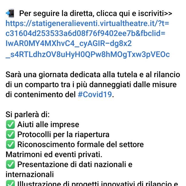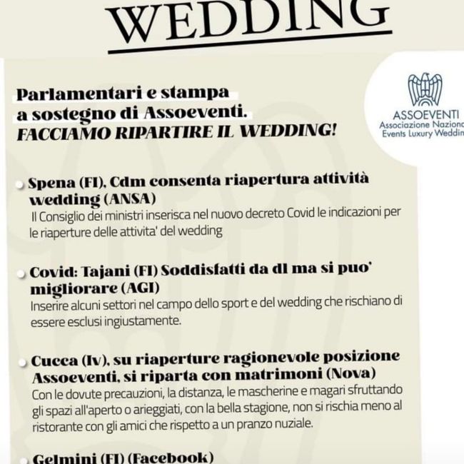 Teniamo duro spose 2021 (io 22 maggio) qualcosa si sta muovendo, io seguo la pagina fb di federmep l'associazione italiana che si occupa di eventi quindi anche matrimoni.. Non rimandate.. Tra non molto avremo le risposte a tutte le nostre domande...