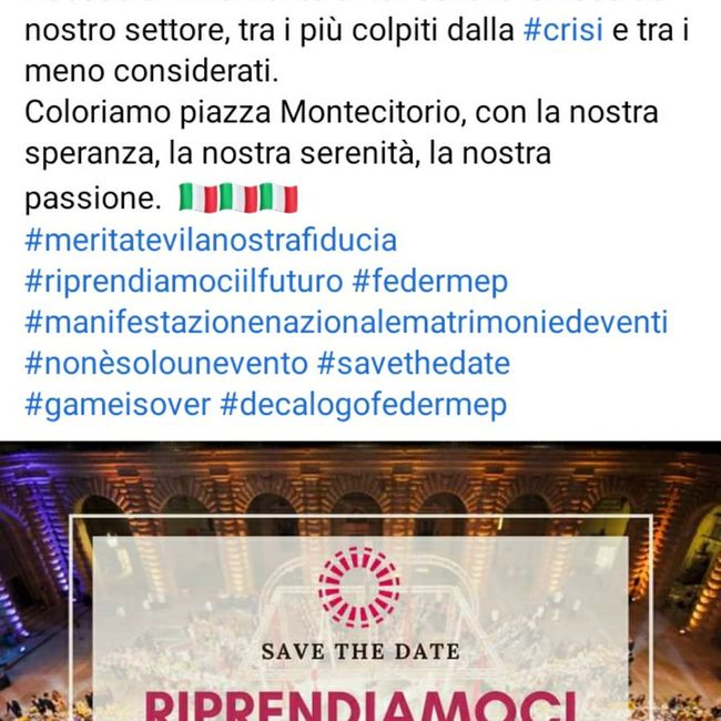 Teniamo duro spose 2021 (io 22 maggio) qualcosa si sta muovendo, io seguo la pagina fb di federmep l'associazione italiana che si occupa di eventi quindi anche matrimoni.. Non rimandate.. Tra non molto avremo le risposte a tutte le nostre domande...