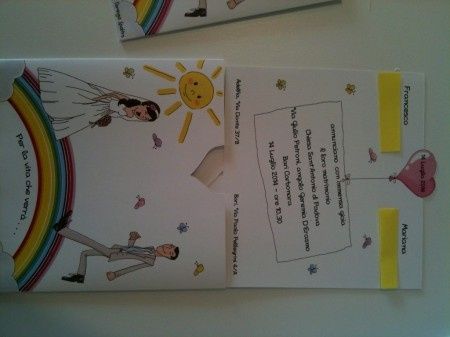Eccoli qui sono quasi pronti! Da Pasqua cominciamo a distribuirli! Il disegno e' stato realizzato da una nostra amica e quindi gli sposini ci assomigliano! Che ne pensate? Un bacetto