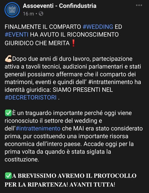 Teniamo duro spose 2021 (io 22 maggio) qualcosa si sta muovendo, io seguo la pagina fb di federmep l'associazione italiana che si occupa di eventi quindi anche matrimoni.. Non rimandate.. Tra non molto avremo le risposte a tutte le nostre domande...