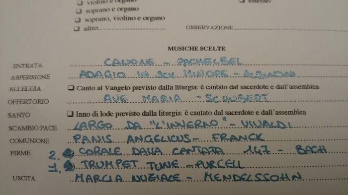 Ciao a tutti! Perchè non raccogliamo qui la lista delle musiche scelte per la cerimonia? così aiutiamo chi è ancora indeciso! forza! comincio io! Ingresso sposo con mamma seguito da 3 coppie (testimoni e damigelle): Pachelbel: Canone in re maggiore...
