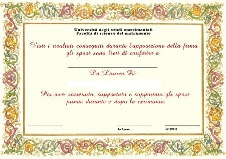Buonasera forummine, girando per il web ho trovato questo simpatico attestato di laurea da compilare come piu preferite.... io li ho fatti 4 x le damigelle e 4 x i testimoni ...li metterò dentor una cornice e le regalerò ad ogniuna di loro il giorno...