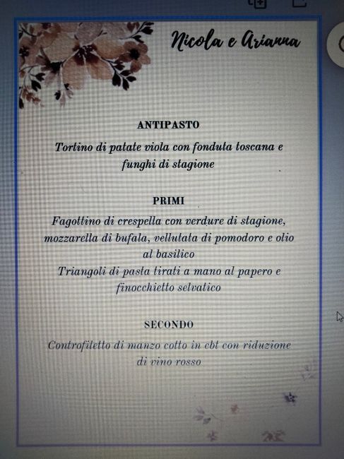 Non parlo di grafica eh 😁ma del menù in sé. Oltre a quello scritto sul menù ci sarà un aperitivo con finger food che comprendono: Bicchierini di burrata e aliciBicchierini di burrata e tartufoVerdure fritteCarpaccio marinato con pomodorini secchi e...