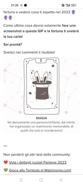 Ora che hai risposto a tutte le domande e so di più su di te, è tempo di guardare alla tua fortuna e vedere cosa ti aspetta nel 2023 🔮🔮🔮 Come ultima cosa dovrai solamente fare uno screenshot a questa GIF e la fortuna ti svelerà la tua carta! Sei...