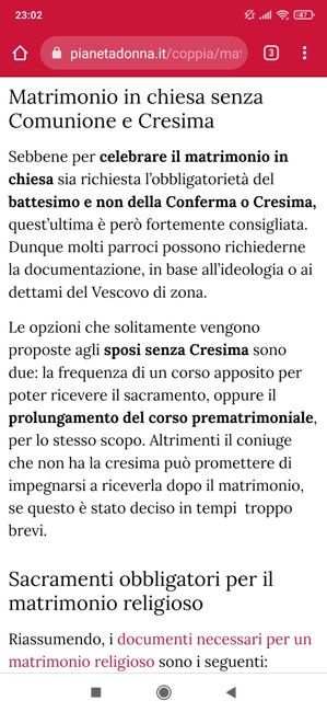 Ciao a tutti. Sapreste dirmi se i testimoni di nozze devono per forza aver conseguito il sacramento della cresima? A quanto ne so io non è necessario, poiché la loro funzione è puramente legata al rito civile (che si svolgerà in chiesa, in...