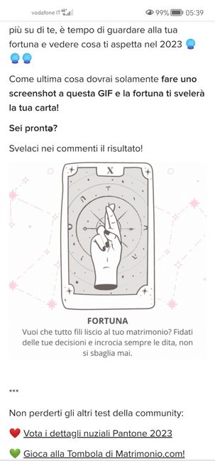 Ora che hai risposto a tutte le domande e so di più su di te, è tempo di guardare alla tua fortuna e vedere cosa ti aspetta nel 2023 🔮🔮🔮 Come ultima cosa dovrai solamente fare uno screenshot a questa GIF e la fortuna ti svelerà la tua carta! Sei...