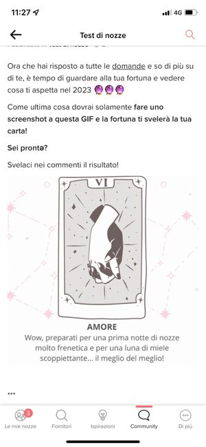 Ora che hai risposto a tutte le domande e so di più su di te, è tempo di guardare alla tua fortuna e vedere cosa ti aspetta nel 2023 🔮🔮🔮 Come ultima cosa dovrai solamente fare uno screenshot a questa GIF e la fortuna ti svelerà la tua carta! Sei...