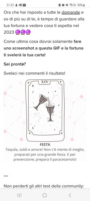 Ora che hai risposto a tutte le domande e so di più su di te, è tempo di guardare alla tua fortuna e vedere cosa ti aspetta nel 2023 🔮🔮🔮 Come ultima cosa dovrai solamente fare uno screenshot a questa GIF e la fortuna ti svelerà la tua carta! Sei...