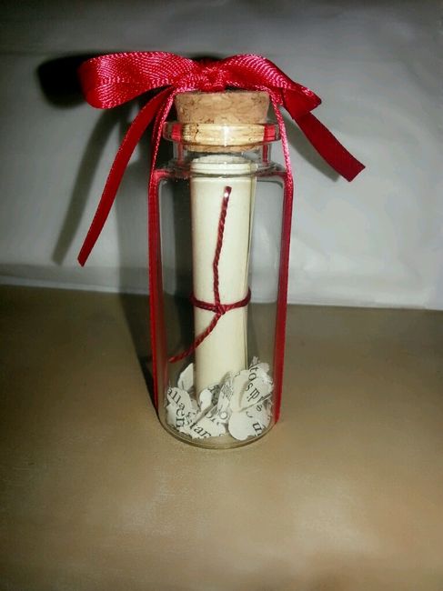 Eccole qua!! Il tema del matrimonio è il libro! Per questo all'interno delle bottigliette ho messo cuoricini fatti con pagine di libro!! Che ne pensate?