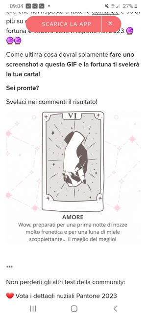 Ora che hai risposto a tutte le domande e so di più su di te, è tempo di guardare alla tua fortuna e vedere cosa ti aspetta nel 2023 🔮🔮🔮 Come ultima cosa dovrai solamente fare uno screenshot a questa GIF e la fortuna ti svelerà la tua carta! Sei...