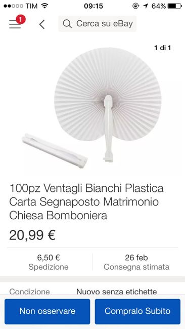 Salve ragazze. ..vorrei comprare i ventagli ...ma non vorrei spendere più di 50 60 eur ...me ne servirebbero 40 o 50 ...ho guardato su aliexpress. ..ma ogni ventaglio e sui 4 ..10 euro e supero la cifra ...dove posso prenderli ...??ad 1 euro 2 euro...