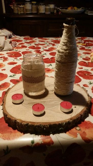 Eccole qua, a parte le candeline rosse che non ci incastrano niente (saranno poi bianche) ,nel barattolo e nelle bottiglie ci andranno i fiori,piccoli e delicati. Io li adoro! ?