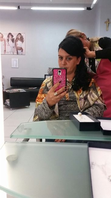 Eccomi qui....con la prova definitiva dalla parrucchiera. C'ho messo anche l'orecchino che ho scelto per vedere l'effetto. La coda è finta ma è molto bella e fatta bene,tant'è che la parrucchiera mi ha chiesto di lasciargliela poi.??
