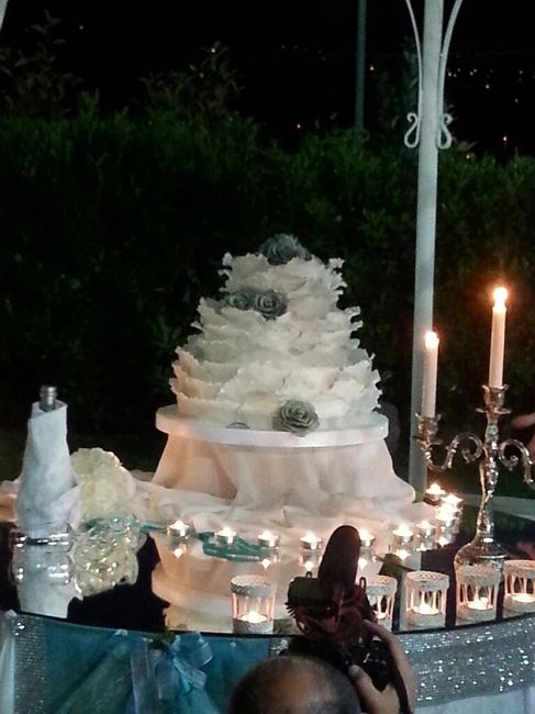 Ciaooo questa era la nostra wedding cake mi sn sposata il 4 giugno! Poichè il tema è stato il panna e verde tiffany l'ho voluta bianca cn i fiori tiffany ..