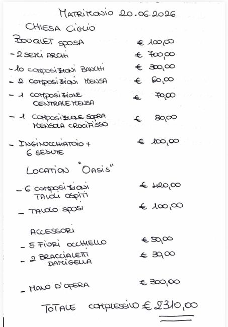 Buona sera a tutti, è il primo post che scrivo. Volevo chiedere se per voi questo preventivo per i fiori è eccessivo o giusto: 1 composizione floreale di nebbiolina per altare2 composizioni accanto a noi sposi6 puoff di nebbia nella navata a terra +...