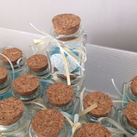 Anche le bomboniere sono pronte a -18. Abbiamo scelto questi vasetti portaspezie che, secondo noi, sono molto carini. Li abbiamo riempiti di confetti al cioccolato bianchi ed azzurri a forma di cuore...
