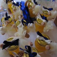 Sono arrivate, con confetti, bigliettino con nomi (e sul retro scadenza e lotto di produzione del miele, in sicilia), decorazione in rafia bianca (abbiamo aggiunto noi nastro di raso blu) e miele di...