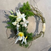 Stamattina sono stata dalla fioraia e abbiamo fatto una prova del bouquet: Iris gialli e orchidee. La “maniglia” verrà fatta con lo stesso tessuto della gonna, sul dorato… Aveva provato a farne anche...