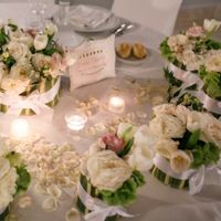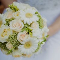 Un unico bouquet di gerbere bianche e roselline. Mi piace molto la combinazione bianco e verde muschio brillante! Già fatto vedere la foto al fioraio che dice che mi accontenterà